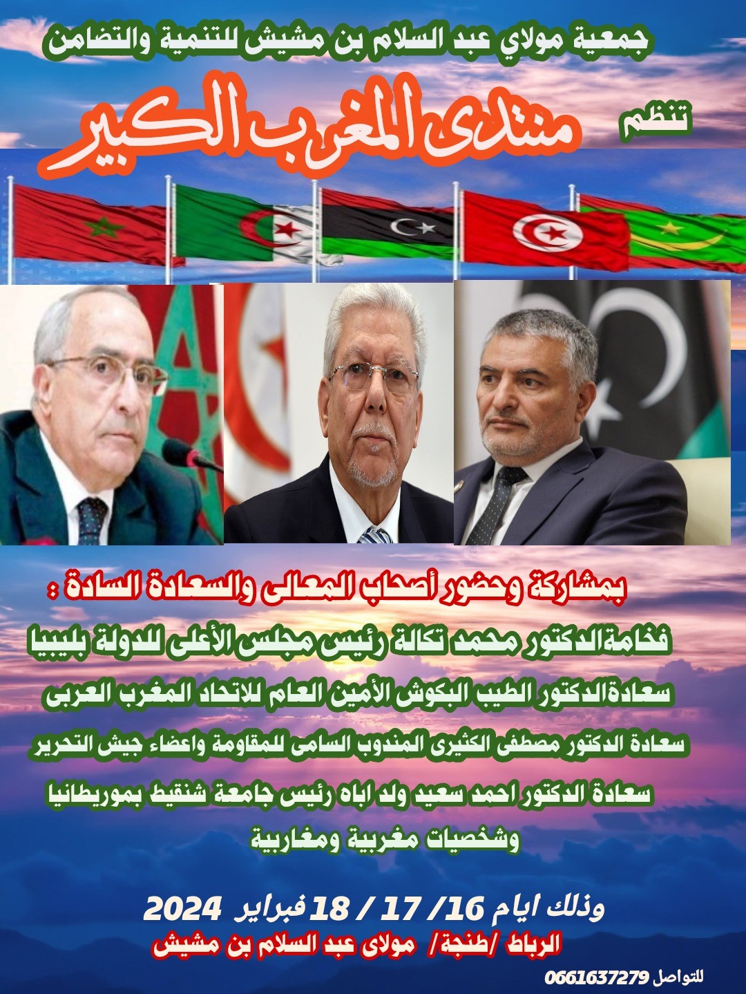 وايمانا بهذه الرؤية الملكية السامية وعملا على تحقيق الحلم المغاربي المشترك على مستوى منظمات المجتمع المدني فان جمعية مولاي عبد السلام بن مشيش للتنمية والتضامن سوف تنظم منتدى المغرب الكبير ويتضمن برنامج المنتدى يوم الجمعة 16 فبراير 2024 زيارة ضريح محمد الخامس للترحم على الروح الطاهرة للملكين العظيمين صاحبا الجلالة محمد الخامس والحسن الثانى قدس الله روحهما